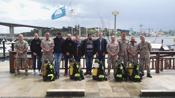 En la foto la Dra. Ana Crespo Solana en compañía del director de la excavación, el Dr. Miguel San Claudio, el alcalde de Ribadeo (D. Fernando Suárez Barcia), el Dr, Arnaud Cazenave, Christine Heamagi, de Maritime Archaeology Trust (Southampton), el prof. Nigel Nayling (UWTSD) y el comandante D. Angel Lozano, con componentes del equipo de Buceo de la Armada de El Ferrol, que realizan un extraordinario trabajo de apoyo en la investigación subacuática.