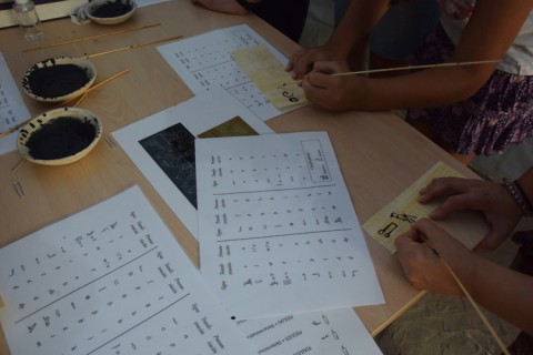 Los ciudadanos han podido conocer los principales utensilios y materiales usados por los escribas: cañas, papiros, pigmentos, morteros, lucernas, etc. A través de reproducciones de estas herramientas, los investigadores han mostrado los procesos de producción de tintas, hojas de papiro y cálamos, así como los sistemas de iluminación empleados en la antigüedad en Egipto. Los investigadores han explicado cuáles eran los tipos y usos principales de los signos jeroglíficos y cómo funcionaba el sistema de escritura del Egipto antiguo. Los asistentes han podido aprender a usar el cálamo, las tintas y el papiro para escribir a la manera de los escribas antiguos algunas palabras sencillas, como sus nombres.