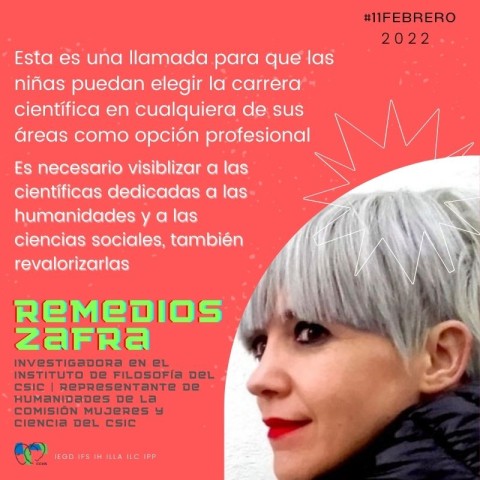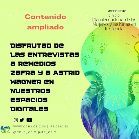 • Entrevistas en vídeo. Las investigadoras del Instituto de Filosofía Remedios Zafra y Astrid Wagner reflexionan en sendos vídeos online disponibles en el canal de Youtube del CCHS  y en la red social Twitter sobre la necesidad de referentes femeninos en la ciencia, y en el papel de las humanidades y las ciencias sociales para avanzar en la participación plena de las mujeres en el ámbito de la I+D.