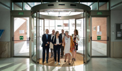 Eulalia Pérez Sedeño y Txetxu Ausín (IFS-CSIC) recibiendo en la inauguración del XIV Congreso Iberoamericano de Ciencia, Tecnología y Género a Jorge Sainz González del Consejo Asesor de la OEI y Ricardo Mairal Usón, rector de la UNED. 13 de septiembre de 2023 / Lorenzo Plana Torres / CSIC.